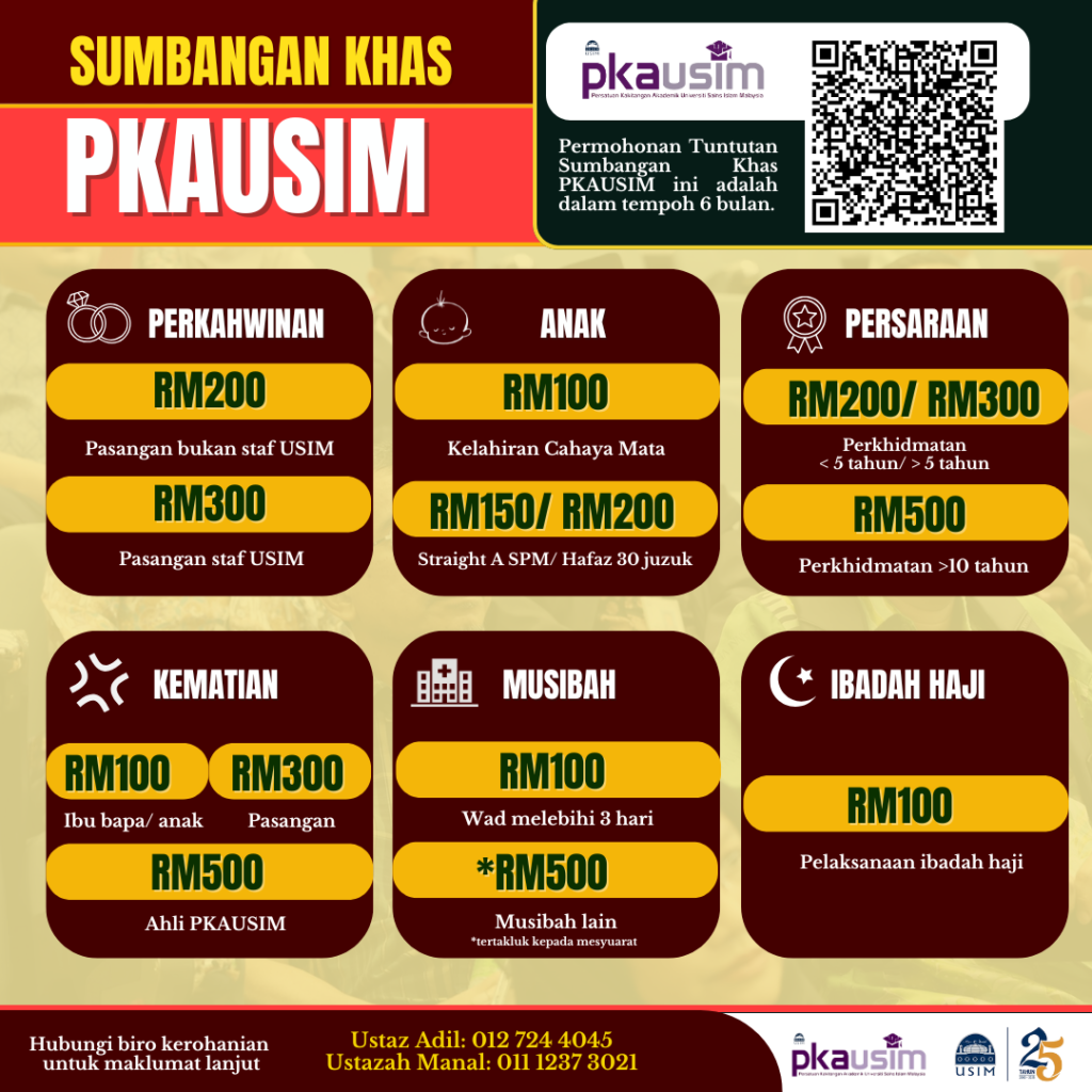 Sekiranya Tuan/Puan mempunyai masalah berhubung permohonan Tuntutan Sumbangan Khas PKAUSIM, sila hubungi Biro Kerohanian & Kebajikan dibawah:
